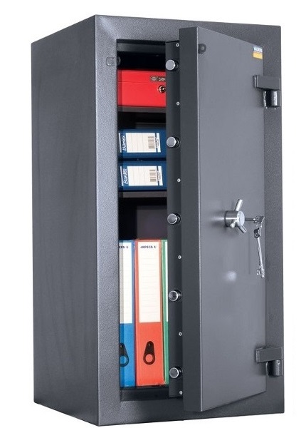 - На дверь сейфа устанавливается ключевой замок KABA MAUER производства Германии (в комплекте два ключа) и трёхсторонняя усиленная ригельная система запирания, а также система блокировки ригельного механизма при взломе.